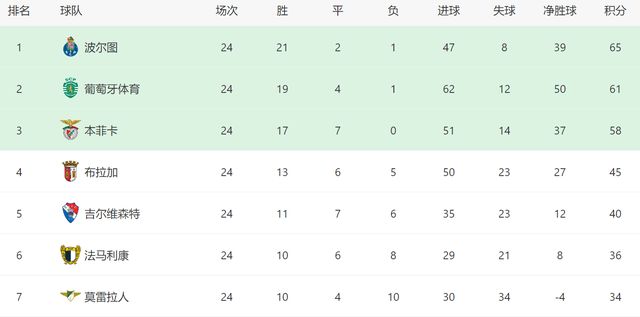 本场过后,本菲卡在葡超迎来4连胜,本赛季继续在联赛保持不败。遗憾的是,24轮联赛,本菲卡出现多达7场平局,导致他们如今依然只能排名第三位。截至目前,本菲卡落后榜首的波尔图7分,争冠依然有一线希望。此外他们和第二的葡萄牙体育只有3分的差距,欧冠席位并非遥不可及。